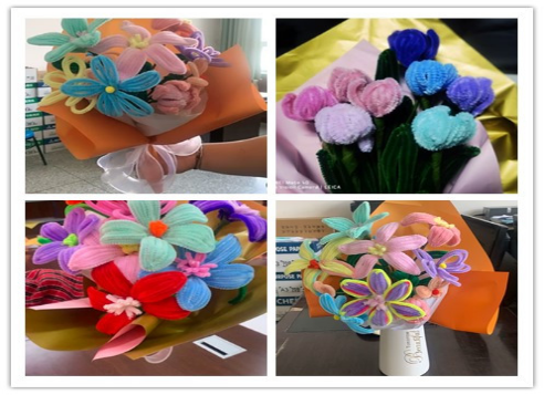 活动开始前,魏晓柳副书记为大家送上了节日的祝福。活动中,大家先跟随老师学习了百合花和小雏菊的制作方法,经过选色、对折、固定、组合等一系列步骤,一朵朵鲜艳的花朵呈现在大家手中。各位老师还齐齐发动创新,制作出了荷花、玫瑰花、紫罗兰……大家相互交流学习制作技巧,展示自己制作的花朵,活动现场气氛融洽。活动最后,大家把自己做好的花朵聚成一束包上花纸,一捧捧永不凋谢的花捧就完成了。