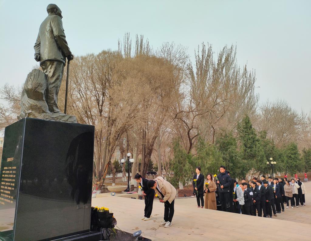 向王震将军铜像三鞠躬,寄托哀思,深切缅怀,依次上前敬献鲜花。